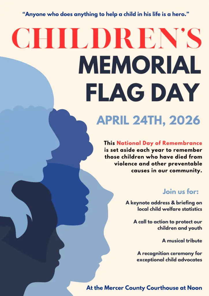 According to the National Children’s Alliance, in 2022 an estimated 558,899 children were confirmed victims of abuse and neglect in the United States, the most recent year for which there is national data. Additionally, it is reported that nearly 2,000 (1,990) of these children died from their abuse and neglect. Despite the sobering and grim reality of child maltreatment, communities are diligently working to improve these statistics and the lives of children. There are state and legal protections to investigate and prosecute reported incidents of abuse. Agencies and entities like DoHS and Child Protective Services, Judges and Prosecutors, Law Enforcement, and Child Protect of Mercer County stand in place to protect these most vulnerable citizens. There are services to support these child victims, like therapy, foster care and kinship care, forensic interviewing, legal representation (Guardian Ad Lietems), supervised visitation, mentoring, and various advocacy efforts to help meet their unique needs and treat trauma exposure. There are even preventative efforts to combat child abuse, such as Body Safety presentations in the schools and awareness events and initiatives like Children’s Memorial Flag Day and Child Abuse Prevention Month. Most importantly, prevention is achieved through programs that address the underlying causes of abuse. Pervasive social issues, like child abuse and maltreatment, require a united community response to combat the issue on multiple fronts.